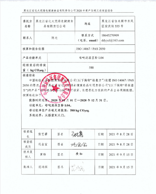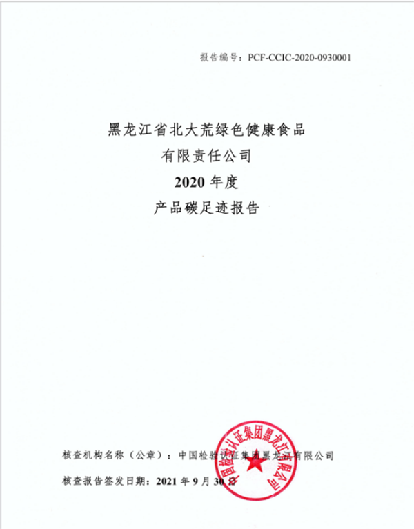 黑龍江省北大荒綠色健康食品有限責(zé)任公司2020年產(chǎn)品碳足跡報告